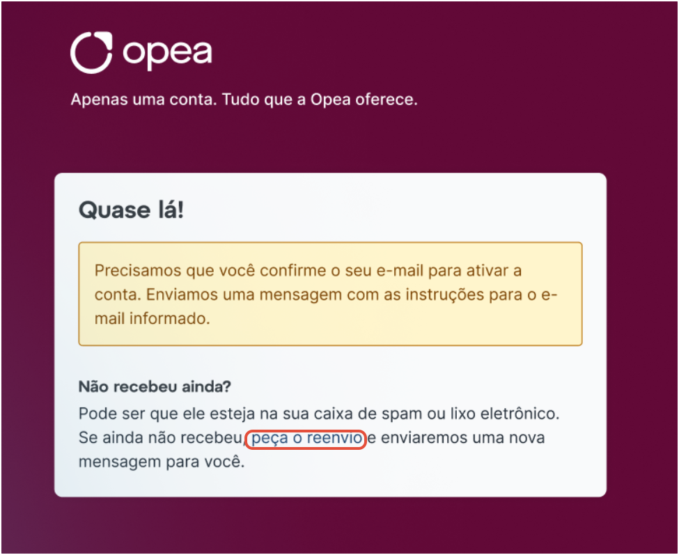 Caso o e-mail não seja recebido na sua caixa de entrada, verifique a caixa de spam. Se, mesmo assim, a mensagem não tenha chegado, clique em "peça o reenvio", conforme indicado na Figura 3.