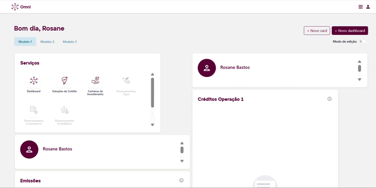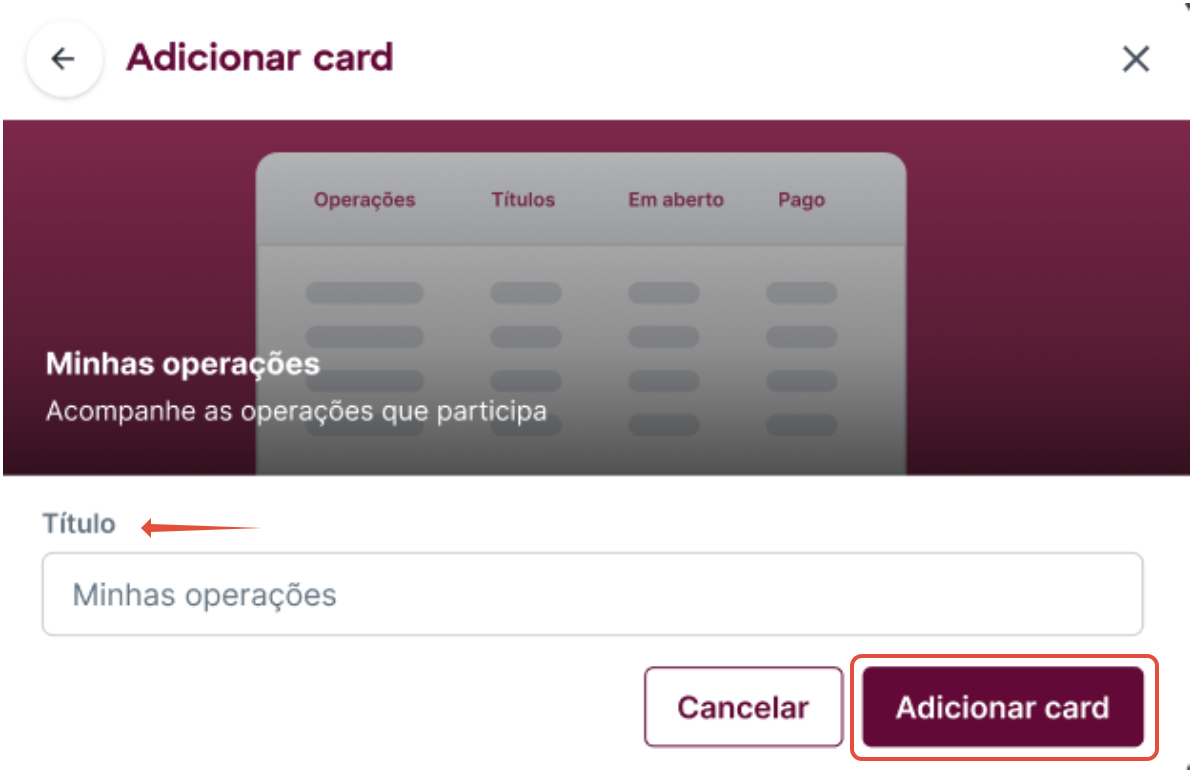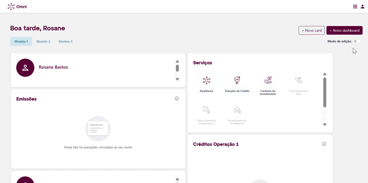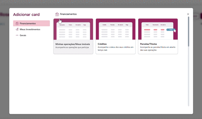 Você poderá criar até 8 (oito) novos painéis e adicionar a eles cards contendo visualizações resumidas dos Portais de Financiamento (Agro, Imobiliário ou Corporativo), Carteiras de Investimentos e Soluções de Crédito. Além disso, é possível incluir cards com informações gerais, proporcionando uma visão abrangente e adaptada às suas demandas.