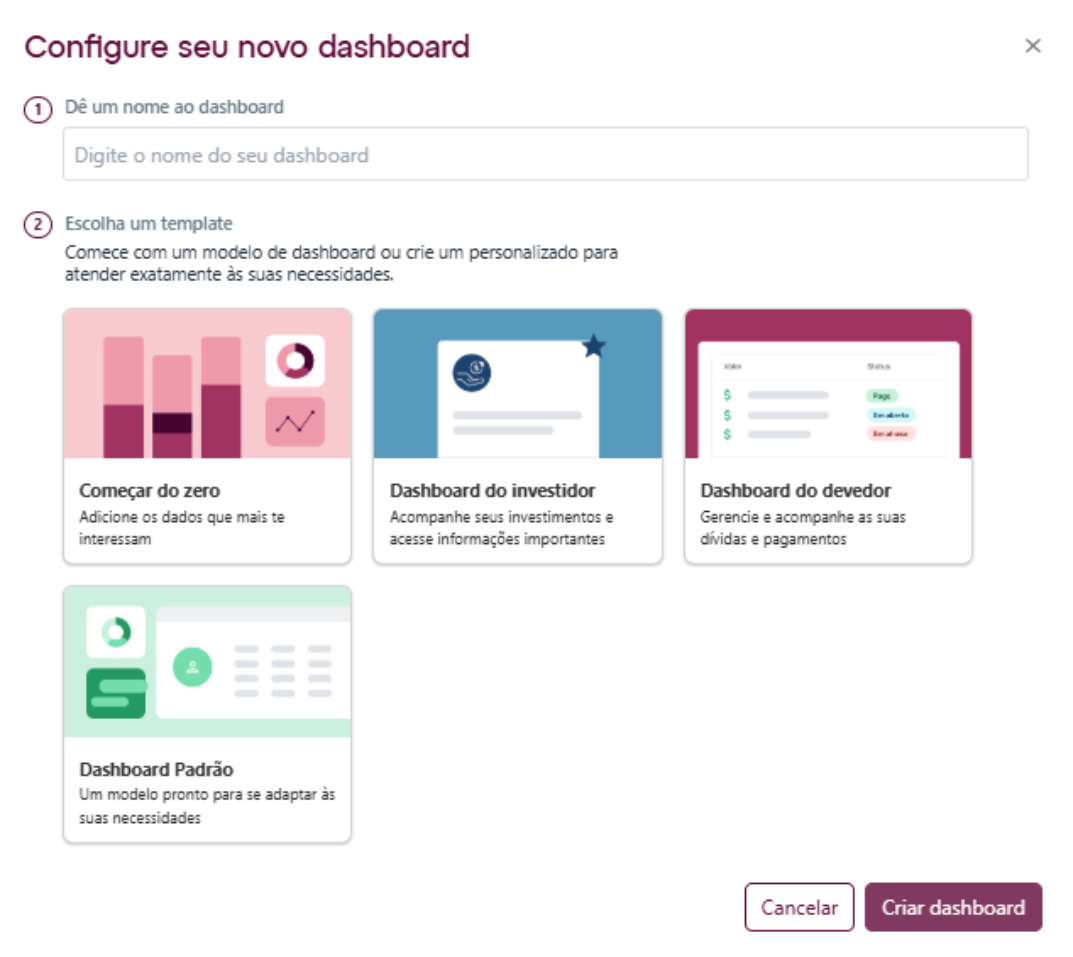 3. Selecione um entre as opções de templates disponíveis, podendo optar entre começar do zero, ou um pré-definido (Dashboard do investidor, Dashboard do devedor ou Dashboard padrão).