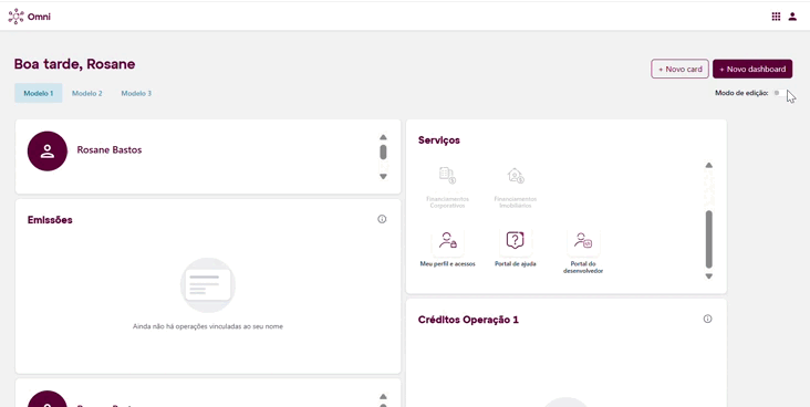 O principal objetivo dos cards é oferecer uma visão clara, rápida e objetiva dos serviços disponibilizados para o seu negócio, tudo em um ou mais painéis. Para obter uma visualização mais detalhada de cada serviço, recomendamos acessar seu respectivos portais. (Consultar artigo: Menu de Serviços do Omni)