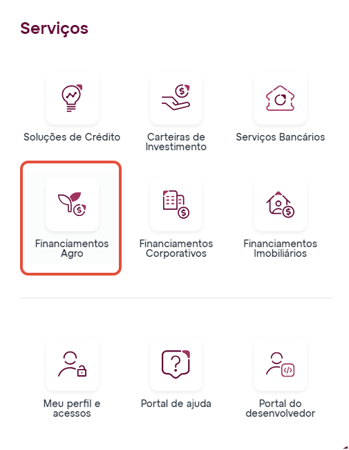 Após acessar o Portal Omni, clique no ícone de Serviços, conforme indicado na Figura 2, para visualizar a relação dos sistemas disponíveis. Em seguida, selecione a opção "Financiamentos Agro" (Figura 3) para ser direcionado à plataforma correspondente.