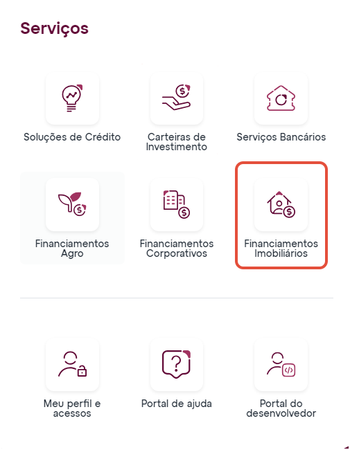Após acessar o Portal Omni, clique no ícone de Serviços, conforme indicado na Figura 2, para visualizar a relação dos sistemas disponíveis. Em seguida, selecione a opção "Financiamentos Imobiliário" (Figura 3) para ser direcionado à plataforma correspondente.
